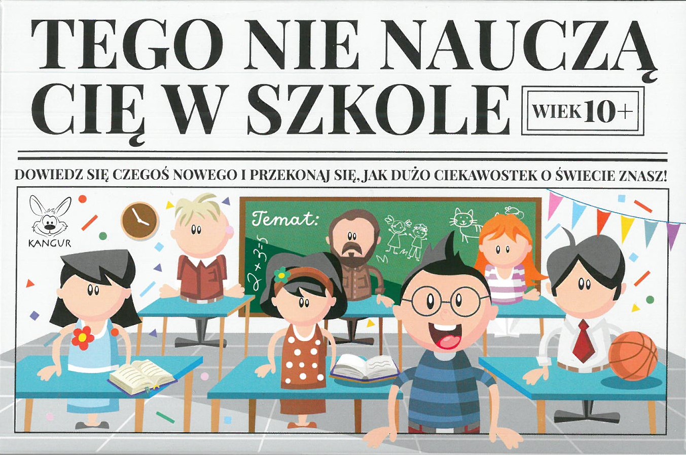 Tego nie nauczą cię w szkole : dowiedz się czegoś nowego i przekonaj się, jak dużo ciekawostek o świecie znasz! - Białystok : Kangur, [2023]. - 1 gra (54 karty do gry, instrukcja) : ilustracje, karton, tektura, kolor ; 18x12x4 cm.